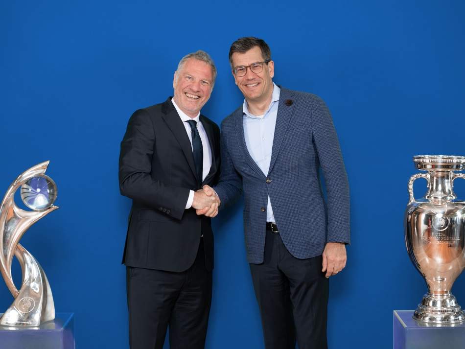 Die Unternehmen der Schwarz Gruppe erweitern ihr Engagement im europäischen Fußball und vereinbaren eine langfristige strategische Partnerschaft mit der Union der Europäischen Fußballverbände (UEFA) – die erste der UEFA-Geschichte. Dafür knüpft auch Lidl engere Bande mit der UEFA. Beide Seiten bündeln ihre Kompetenzen, um bewusste Ernährung und einen aktiven Lebensstil über den europäischen Profifußball in den Breitensport zu transportieren. Das Bild zeigt Guy-Laurent Epstein, Marketingdirektor der UEFA (links) und Jens Thiemer, Chief Customer Officer Lidl International.