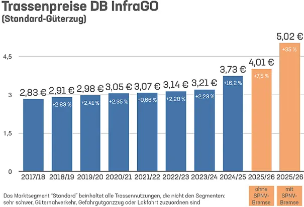 Demnach fordert die DB InfraGO für die Fahrplanperiode 2025/26 einen Preis von 5,02 EUR pro Kilometer. Selbst mit Trassenpreisförderung müssten die Bahnen 4,06 EUR zahlen. „Güterbahnen“-Geschäftsführer Peter Westenberger warnt deshalb vor einem „Trassenpreiskollaps”.